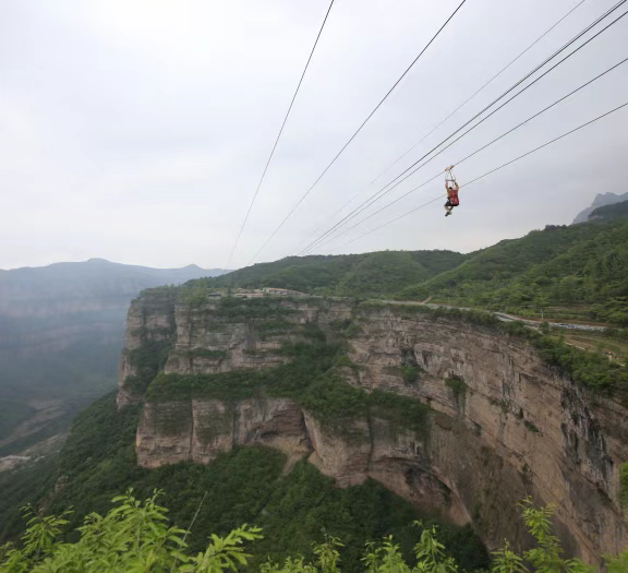 太行大峽谷高空滑索由平步青云上方“飛”至羞女峰觀景臺(tái),跨越峽谷長(zhǎng)度500米,離谷底有300米落差,采用無(wú)動(dòng)力型直滑式單承載式滑索,設(shè)立上站和下站,滑索上、下站兩端用特種鋼芯鋼絲繩連接,形成架空軌道,依靠?jī)啥说母卟,滑具載客后,靠自身重力下滑至著陸平臺(tái)。
