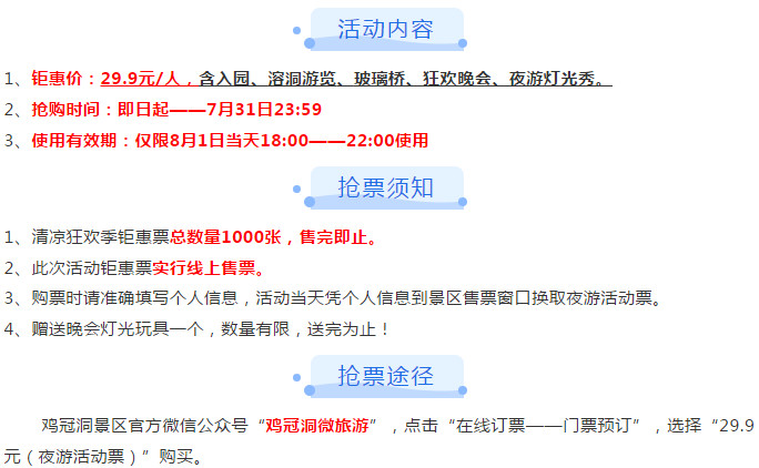 為回饋廣大游客朋友的厚愛(ài)與支持,雞冠洞景區(qū)特推出清涼狂歡季鉅惠票搶購(gòu)活動(dòng)!