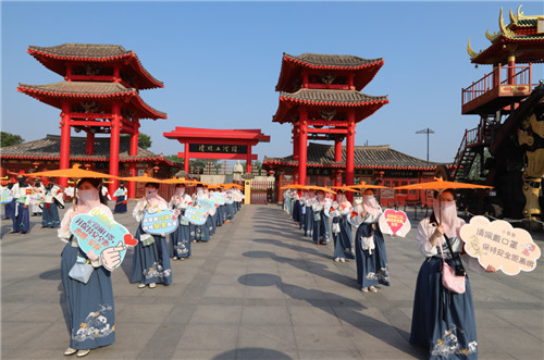景區(qū)在全面確保防疫的基礎(chǔ)上,堅持把文化和歡樂帶給游客!清明上河園結(jié)合景區(qū)文化,創(chuàng)新創(chuàng)意,在全國首創(chuàng)“蒙面式情景展示”,園區(qū)內(nèi)上千名演職人員、商戶和工作人員均佩戴口罩和面紗迎接游客,雙重防護化身大宋“蒙面?zhèn)b”,全方位確保游客在清明上河園安心、放心、舒心游園。