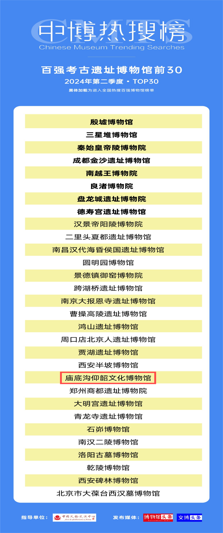 中博熱搜榜被譽(yù)為“熱門博物館風(fēng)向標(biāo),優(yōu)質(zhì)展覽大眾指南”。2022年1月,三門峽廟底溝博物館首次榮登熱搜榜,“入選2021年第四季度全國(guó)熱搜博物館百?gòu)?qiáng)榜單”;2024年4月第二次榮登熱搜榜,入選2024年第一季度“考古遺址博物館前30”榜單;7月第三次榮登熱搜榜,入選第二季度“考古遺址博物館前30”榜單。連續(xù)登榜直觀地表現(xiàn)了廣大網(wǎng)友對(duì)廟底溝博物館的喜愛(ài)和關(guān)注,反映了廟底溝博物館社會(huì)影響力的不斷提高。