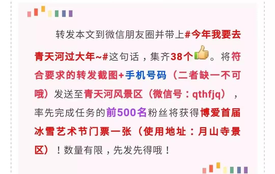 農(nóng)歷除夕到正月十五(2019年2月4日—2月19日)游客購買青天河雙程船票買二送一;2019年1月18日—2019年2月28日,游客憑青天河景區(qū)船票可享受免月山寺門票的優(yōu)惠! 冰雪藝術節(jié)門票 贏!