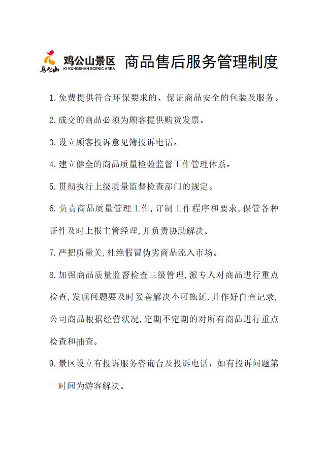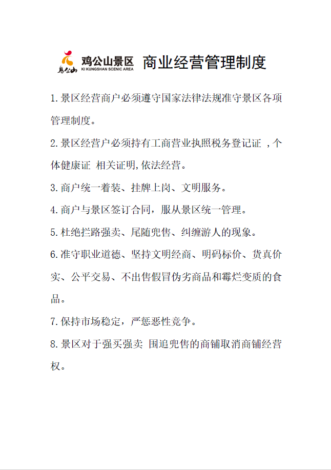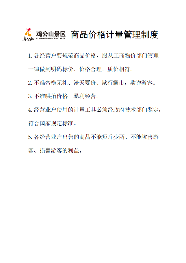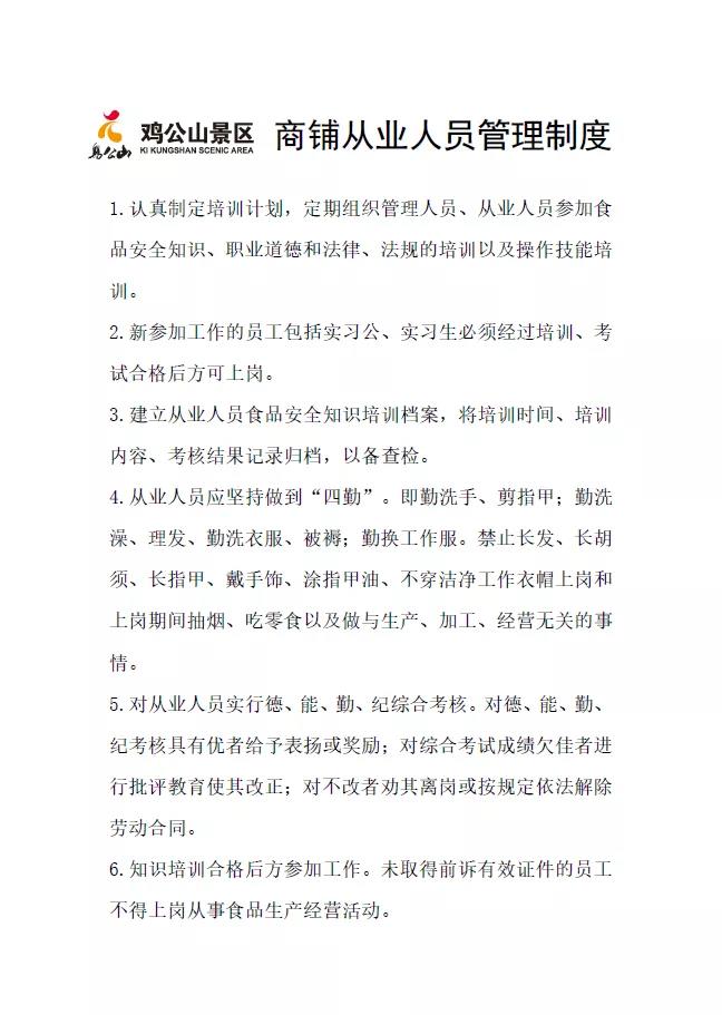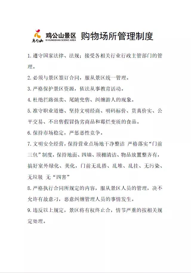 雞公山景區(qū)對(duì)各經(jīng)營場(chǎng)所所有商品經(jīng)營從業(yè)人員采用統(tǒng)一的管理措施,包括《景區(qū)商品價(jià)格管理制度》、《景區(qū)計(jì)量管理制度》、《景區(qū)經(jīng)營從業(yè)人員守則》,并與商品經(jīng)營從業(yè)人員簽訂協(xié)議,對(duì)違反協(xié)議的按規(guī)定進(jìn)行處罰。