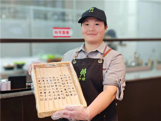 “我們每根面條上的甲骨文字各不相同,有的是‘大吉大利’,有的是‘日進(jìn)斗金’,還有的是‘吉祥安康’,大都是一些祝福話語,也希望將這份祝福送給每位到館參觀的游客。”餐廳負(fù)責(zé)人陳夢敬給記者介紹,他們還特意推出“牛”轉(zhuǎn)乾坤、“鼎”好頂好等套餐,既有美好寓意,又極具地方特色。