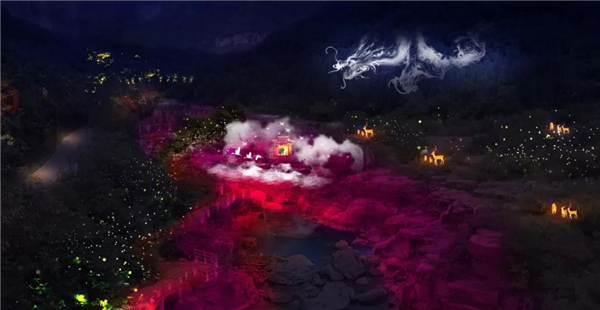 《云臺(tái)·秀》全長1.2公里,是以云臺(tái)山青龍峽的青龍愛情傳說為主線進(jìn)行演繹,講述了明朝永樂年間一條青龍化為青年,與凡間姑娘恩愛相守的故事。采用聲、光、電、全息投影等高科技技術(shù),與山水深度融合,重現(xiàn)千年前的場(chǎng)景!