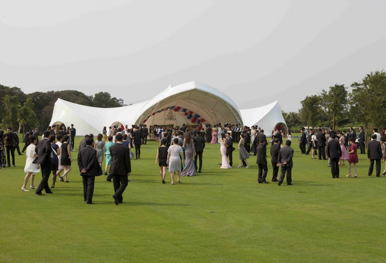 《私人訂制》里有一處豪華的室內(nèi)電影場景,就是在海口觀瀾湖別墅里拍的。進入此座別墅舉目盡覽1號黑石球場美景和醉人的熱帶風(fēng)光。在椰風(fēng)習(xí)習(xí)、陽光明媚的?谟^瀾湖黑石球場上,猶如歌劇院造型的白色帳篷,點綴在萬頃碧野。據(jù)觀瀾湖方面工作人員介紹,這是馮小剛開拍《私人訂制》時 留下的電影道具——“成人帳篷禮”,現(xiàn)已成為新人拍攝婚紗、舉辦婚禮的地方。