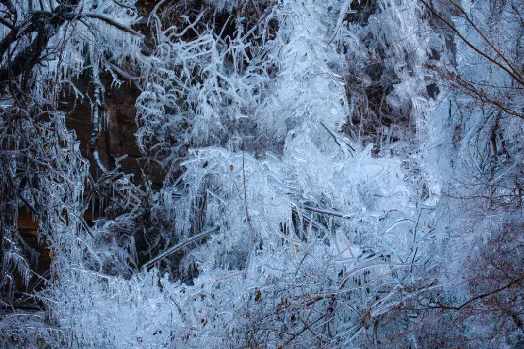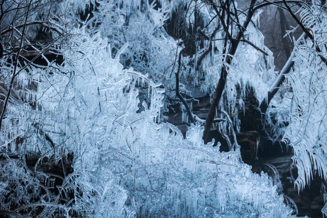 夏日里泉水叮咚的山谷,此刻似乎施展了神奇的魔法,冰掛、冰瀑奇景初現(xiàn),晶瑩剔透,宛如凝脂,又如和田玉般,溫潤無瑕。