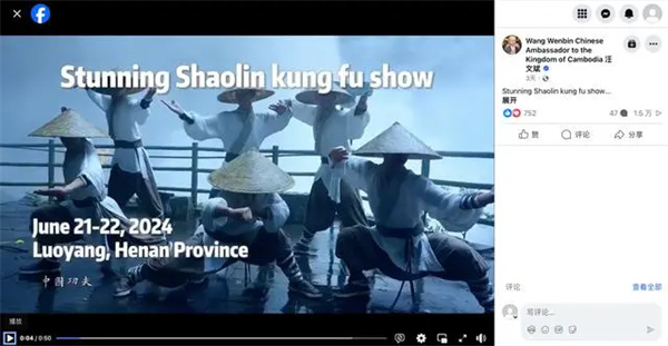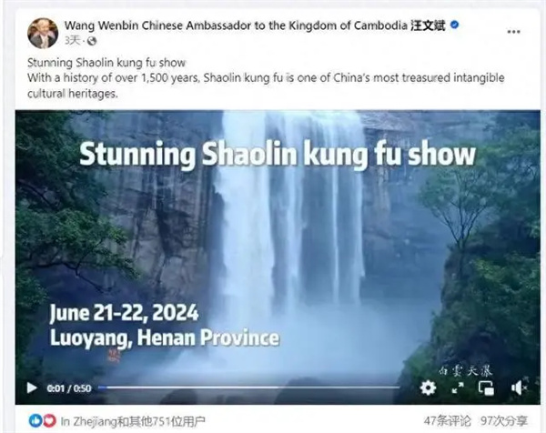 近日,中國(guó)駐柬埔寨王國(guó)特命全權(quán)大使汪文斌在其海外賬號(hào)Facebook(臉書)上,分享了一段主題為《少林男團(tuán)》的視頻。該視頻拍攝于嵩縣白云山景區(qū),截至9日18時(shí),視頻播放量已近2萬(wàn)次。