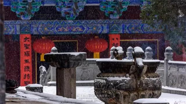 小雪節(jié)氣剛到,初雪就迫不及待地輕輕舞落在這片朱紅與金黃的大地上。