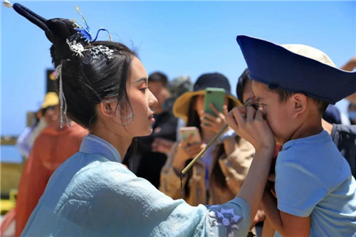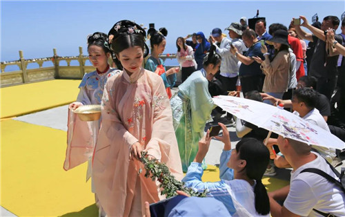 端午來老君山,哪兒能不畫額?五月初五,五毒蛇蟲活躍,老君山的仙女小姐姐給游客額頭點上一滴雄黃酒,消毒防病,蟲豸不盯。