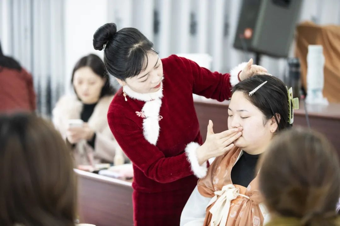 培訓(xùn)課上,欒川縣幸福密碼培訓(xùn)機構(gòu)的老師給大家詳細講解了面部輪廓、化妝的作用及生活妝造特點等理論知識,并挑選多位模特,分別對生活妝、舞臺妝、古風(fēng)妝三種妝造進行了現(xiàn)場示范講解。