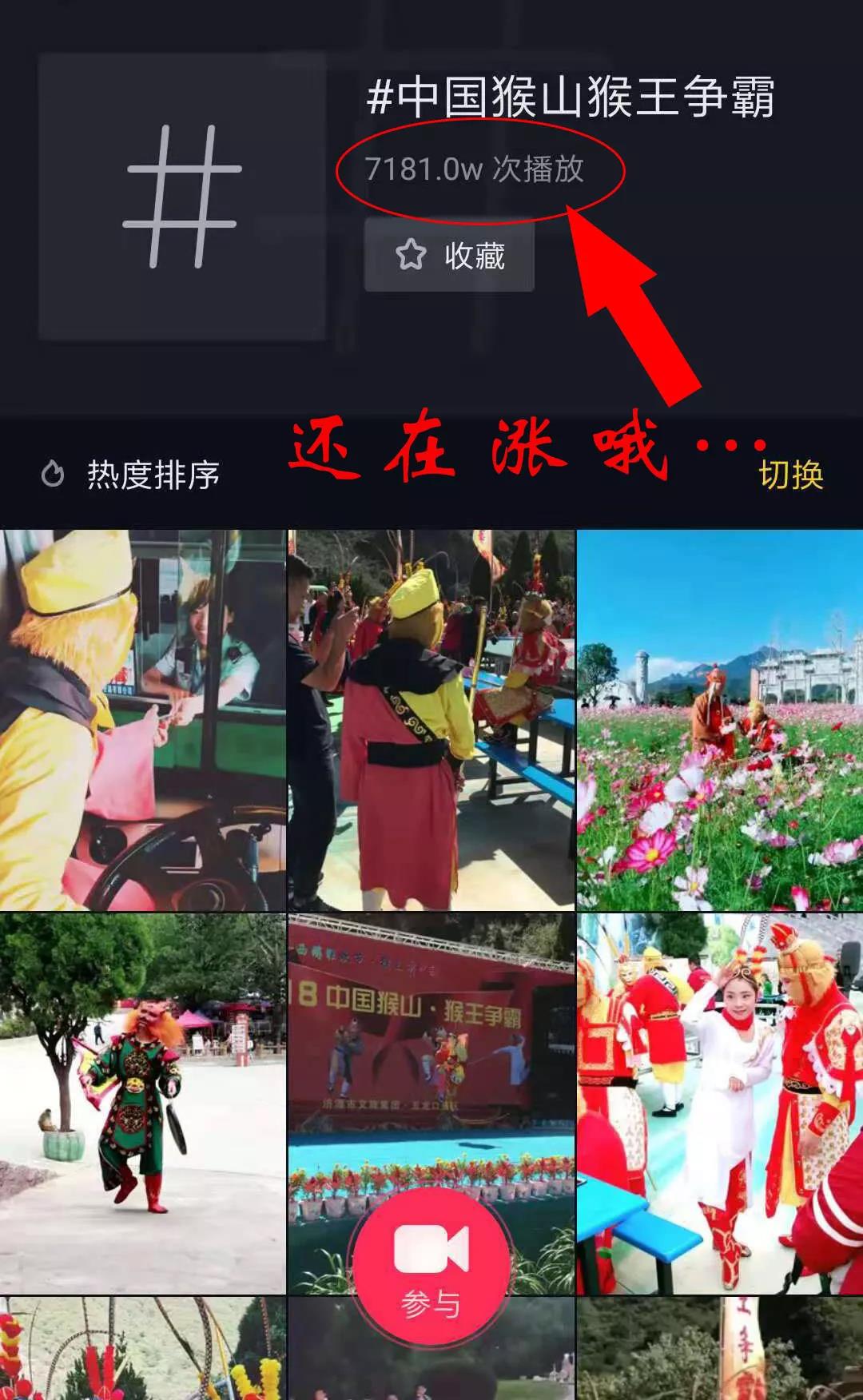 參與抖音話(huà)題 #中國(guó)猴山猴王爭(zhēng)霸,并@叫我大圣,錄制國(guó)慶期間的西游仙魔團(tuán)表演,獼猴日常、景區(qū)內(nèi)與獼猴的互動(dòng)吧!