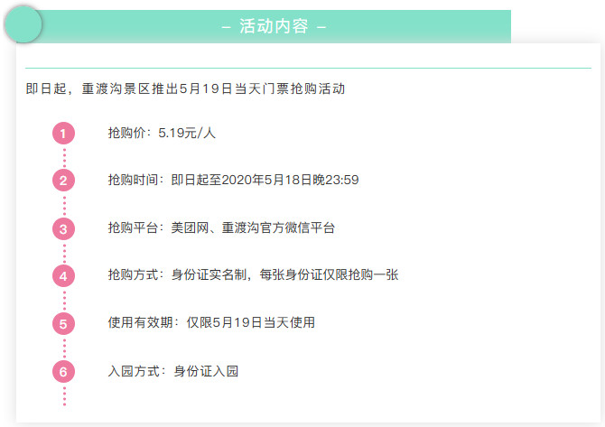 購票通道一:關(guān)注景區(qū)官方微信公眾號“重渡溝風(fēng)景區(qū)”或“重渡溝景區(qū)”選擇“5.19活動”,點擊“在線預(yù)訂”,輸入游玩人姓名手機號身份證號,提交訂單支付即可;