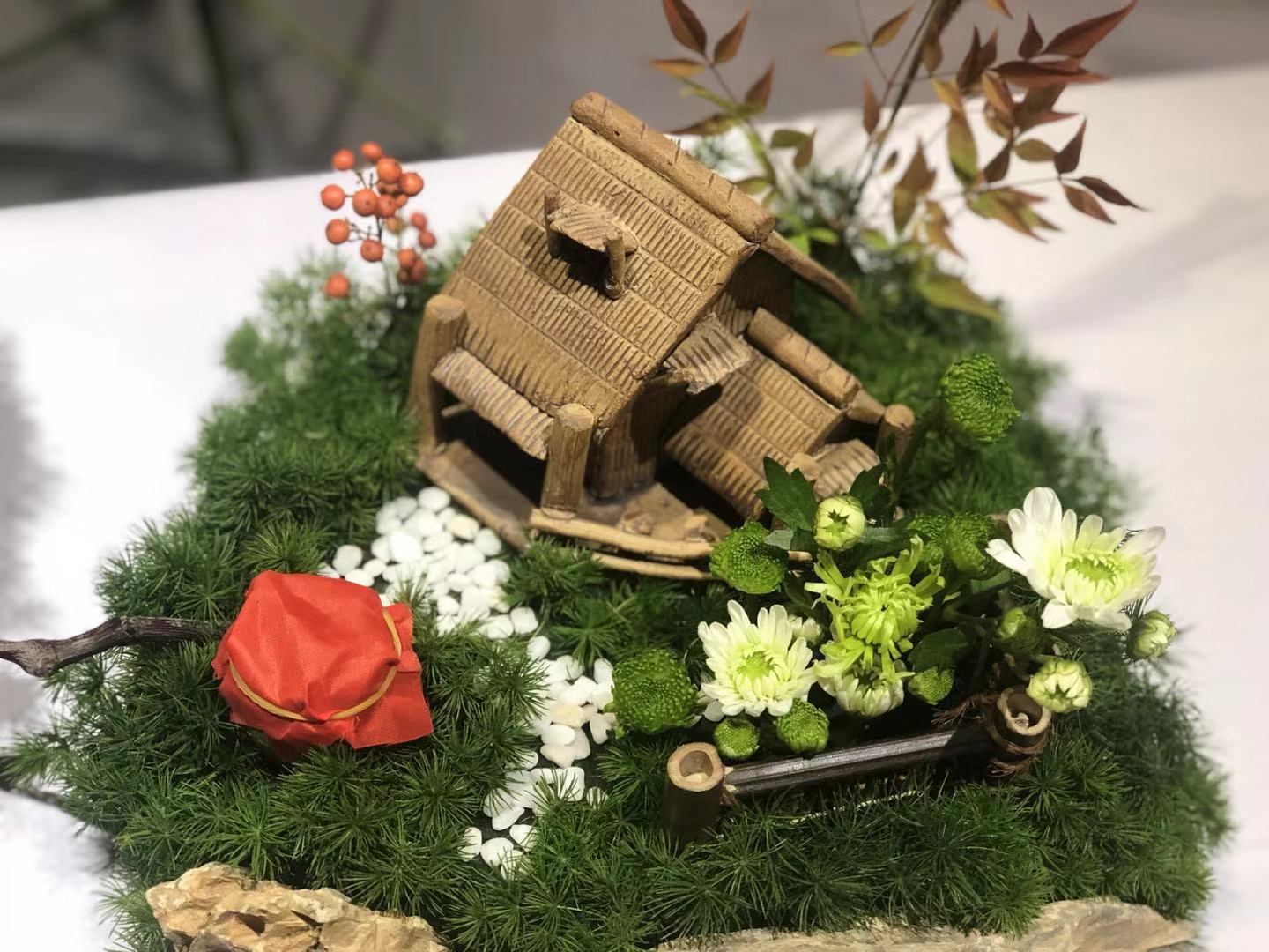 在中國翰園的7個(gè)插花展廳,數(shù)百件代表我國高水平的插花藝術(shù)作品異彩紛呈。插花高手們就地取材,用蘆葦、枯荷等與菊花搭配,發(fā)揮出驚人的想象力,營造出或意境清新悠遠(yuǎn)、或飽含美好寓意的插花藝術(shù)畫面。游客們紛紛拿出相機(jī)、手機(jī),將一幅幅美好的畫面用鏡頭記錄下來。