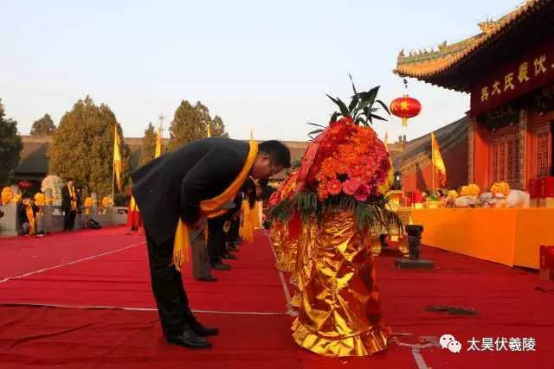 6時59分,恭祭大典正式開始。撞鐘、擊鼓、鳴禮炮。隨后,世界陳氏企業(yè)家聯(lián)誼會首席會長陳陽南先生,中國社會科學院先秦史學會名譽會長馬寶善先生,中國先秦史學會易道研究會副會長鄭萬耕先生,全國工商聯(lián)執(zhí)行委員、豫商聯(lián)合會副會長彭家華先生,中國書畫家協(xié)會副主席韓文甫先生,河南省范蠡商文化促進會副會長張友倫先生,周口市酒業(yè)商會會長張利女士,與太昊陵友好合作的景區(qū)嘉賓,及社會各界代表分別向人祖敬獻花籃、敬香、獻爵。山西省河南商會會長、山西省華嘉盛集團董事長彭家華先生恭讀祭文。公祭大典儀式結(jié)束后,參祭人員深情拜謁了伏羲陵。
