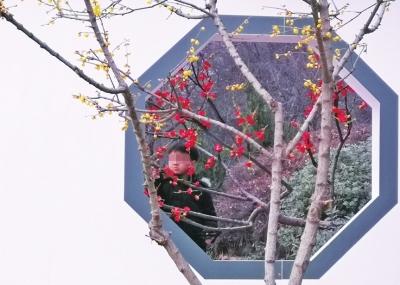 綠蔭公園南廣場(chǎng)一個(gè)長(zhǎng)方形的灰瓦白墻上附詩(shī):“一花香十里,更值滿枝開(kāi),承恩不在貌,誰(shuí)敢斗香來(lái)。”白墻前面堆土造型,稀疏種植盛開(kāi)的蠟梅和紅梅。工作人員介紹,以新中式手法制作的背景墻,配上這首陳與義的“斗香”,意在展現(xiàn)這兩種梅花的疏影暗香。而文博中心廣場(chǎng)四周,則以雪景為背景,布置了40盆妖嬈、虬曲的蠟梅盆景,“希望游客們可以走進(jìn)蠟梅文化,感受蠟梅含苞怒放的生命毅力。”