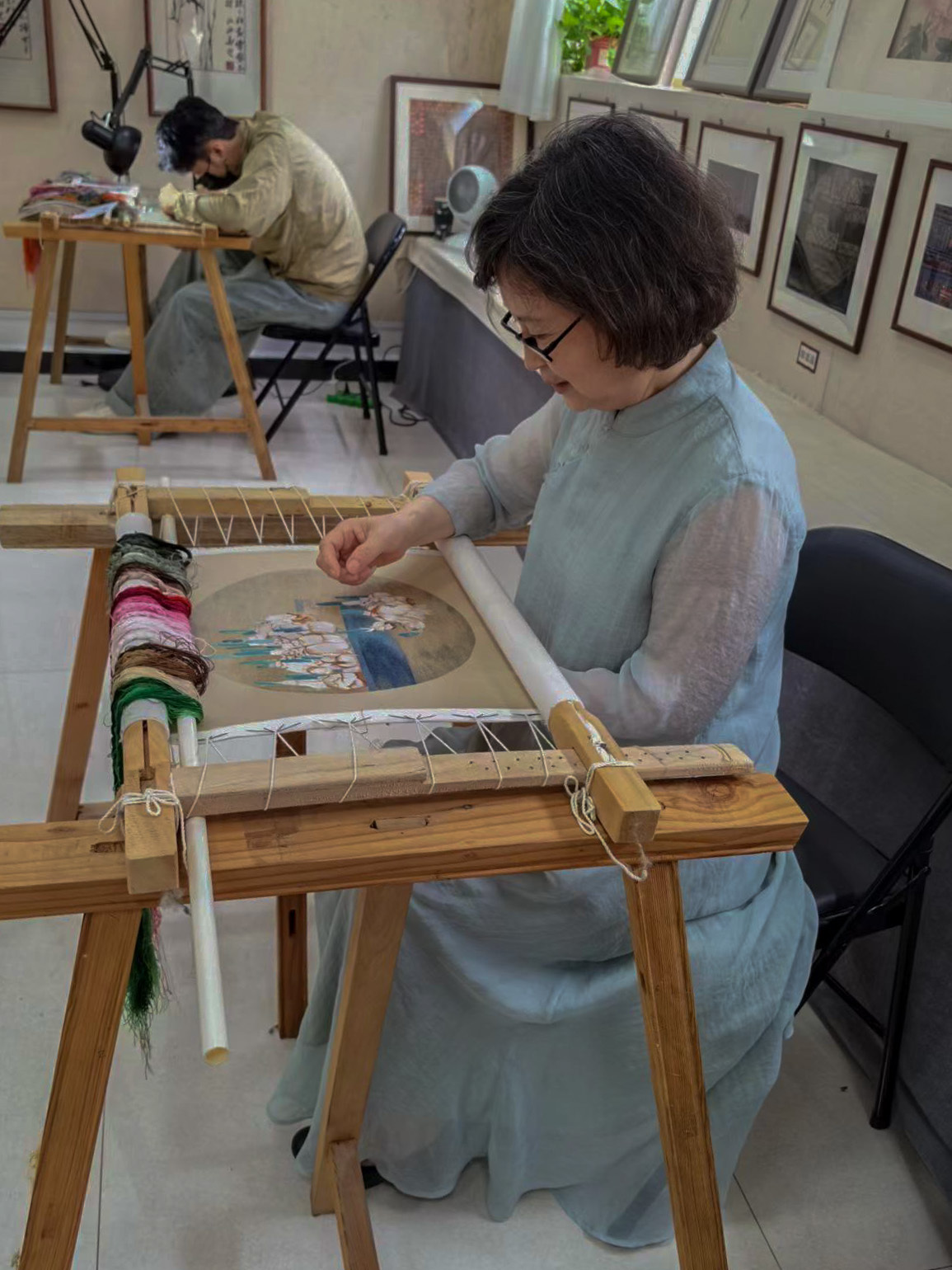 苗煒正在繡水仙圖 祁滿玲 攝