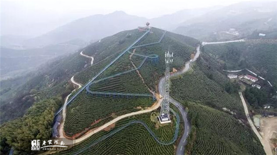 新建成的茶山觀光滑道,根據(jù)茶山陡峭、奇險的地勢特點設(shè)計,全長1200多米,整體落差達(dá)158米,勢如盤龍,依山就勢甚為壯觀。乘坐觀光滑道直達(dá)茶山之頂,舉目四望,山前梯田如鏡,村舍如在畫中。四周峰海山濤、云水煙雨的山水美景如同一幅幅水墨畫展現(xiàn)在眼前。下山時乘坐滑道盤旋而下,茶園竹海如綠波盡入眼底,可享受穿梭于茶山竹林之中、貼地飛行的快感。