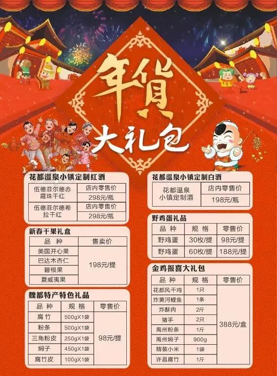 春節(jié)期間,花都溫泉小鎮(zhèn)漢風樓中餐廳特聘名師主廚傾力推出獨具當地特色的團圓飯:158元雙人套餐、298元家庭四人餐、458元六人餐,888元-1988元年夜飯?zhí)撞。另有各種春節(jié)大禮包供您選購。