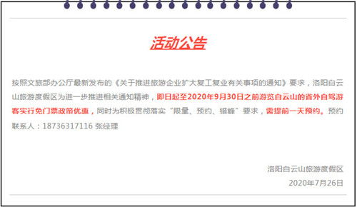 按照文旅部辦公廳最新發(fā)布的《關(guān)于推進(jìn)旅游企業(yè)擴(kuò)大復(fù)工復(fù)業(yè)有關(guān)事項(xiàng)的通知》要求,洛陽(yáng)白云山旅游度假區(qū)發(fā)出通知,即日起至2020年9月30日之前游覽白云山的省外自駕游客實(shí)行免門票政策優(yōu)惠,同時(shí)為積極貫徹落實(shí)“限量、預(yù)約、錯(cuò)峰”要求,需提前一天預(yù)約。