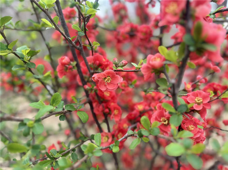 鄭州高新中心體育公園內(nèi)盛開的貼梗海棠 郭鈺坤 攝