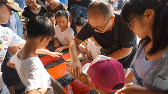 項目一、拓片體驗:很多小孩第一次看到神奇的拓片制作過程,表現(xiàn)出極大的興趣。在拓片師的指導(dǎo)下,小朋友們跟自己的爸爸媽媽一起,大手小手,有板有眼,不一會兒就大功告成,其樂融融。
