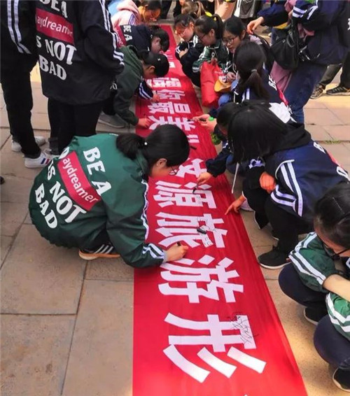 現(xiàn)場,旅發(fā)委給孩子們贈送濟(jì)源旅游美文書籍,文明旅游志愿者李淼淼帶大家領(lǐng)讀《中國公民文明旅游公約》,學(xué)生在條幅上留下自己的簽名,爭做濟(jì)源旅游形象大使。