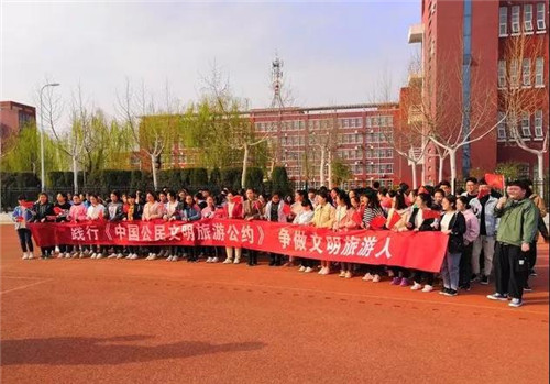 在高級中學(xué),學(xué)生們同樣熱情洋溢地參與了代言活動。大家揮舞著小紅旗,齊聲宣讀《中國公民文明旅游公約》。