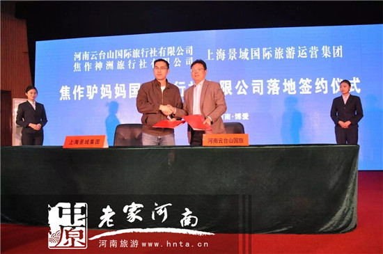 河南云臺(tái)山國(guó)際旅行社有限公司總經(jīng)理馮志堅(jiān)與上海景域國(guó)際旅游運(yùn)營(yíng)集團(tuán)總裁助理任國(guó)才簽訂焦作驢媽媽國(guó)際旅行社落地合作協(xié)議