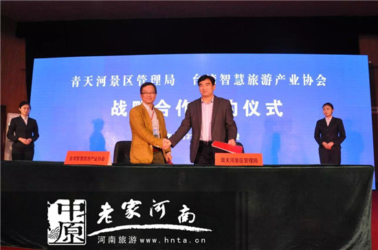 青天河景區(qū)管理局副局長齊高杰與臺灣智慧旅游產(chǎn)業(yè)協(xié)會理事長吳惠恩簽訂戰(zhàn)略合作協(xié)議