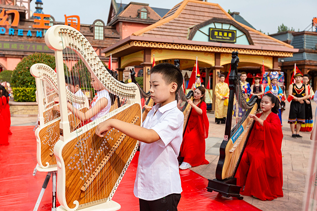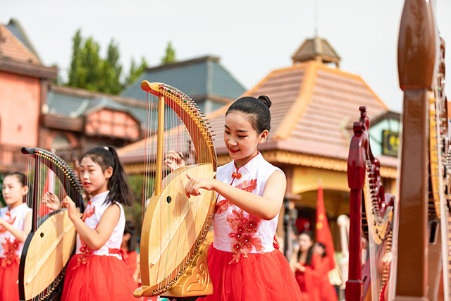 10月1日國慶節(jié)當(dāng)天,在鄭州方特旅游度假區(qū)廣場前,近百名箜篌演奏家奏響《我和我的祖國》。五十六名身著民族特色服飾的演員以及現(xiàn)場游客和著美妙的樂聲,一起唱響祖國贊歌。