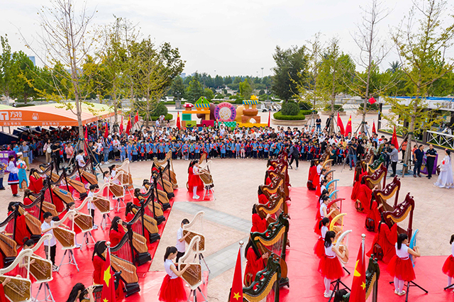 活動當(dāng)天,在處處飄揚(yáng)著鮮艷五星紅旗的方特旅游度假區(qū),百名箜篌演員排列成“71”字樣,五十六名身著民族特色服飾的演員環(huán)繞在其周圍。當(dāng)流傳千年的箜篌奏響《我和我的祖國》時,近千名小學(xué)生和游客游客紛紛圍攏過來,共同唱起祖國贊歌。