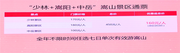 “一票游嵩山”兩大景區(qū)聯(lián)票和三大景區(qū)通票政策,“一票游嵩山”聯(lián)票是整合了嵩陽和中岳兩大景區(qū)8個景點進行聯(lián)票,聯(lián)票之后由原有的嵩陽景區(qū)門票180元+中岳景區(qū)門票100元=280元”降價調(diào)整為“100元全年不限時間任選兩日單次有效游嵩山”,優(yōu)惠折扣低至3.6折。而“一票游嵩山通票”是整合了少林、嵩陽和中岳三大景區(qū)所有景點進行聯(lián)票,聯(lián)票之后由原有的“少林景區(qū)門票170元+嵩陽景區(qū)門票180元+中岳景區(qū)門票100元=450元”降價調(diào)整為“160元全年不限時間任選七日單次有效游嵩山”,優(yōu)惠折扣低至3.5折,這也是最有含金量的優(yōu)惠。