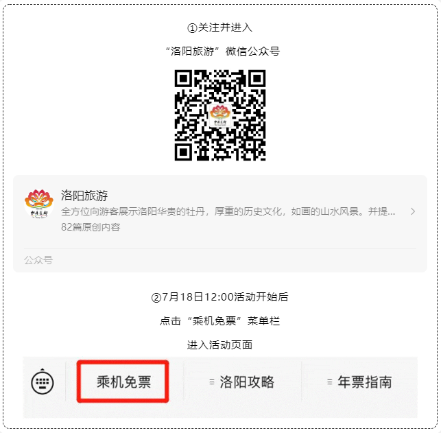 微信搜索“洛陽旅游”、“享游洛陽官方”,進入洛陽旅游或享游洛陽微信公眾號,點擊左下方菜單欄“乘機免票”,進入專題活動頁面預約門票,預約時請仔細關注提示信息。(2023年7月18日12:00開啟預約通道)