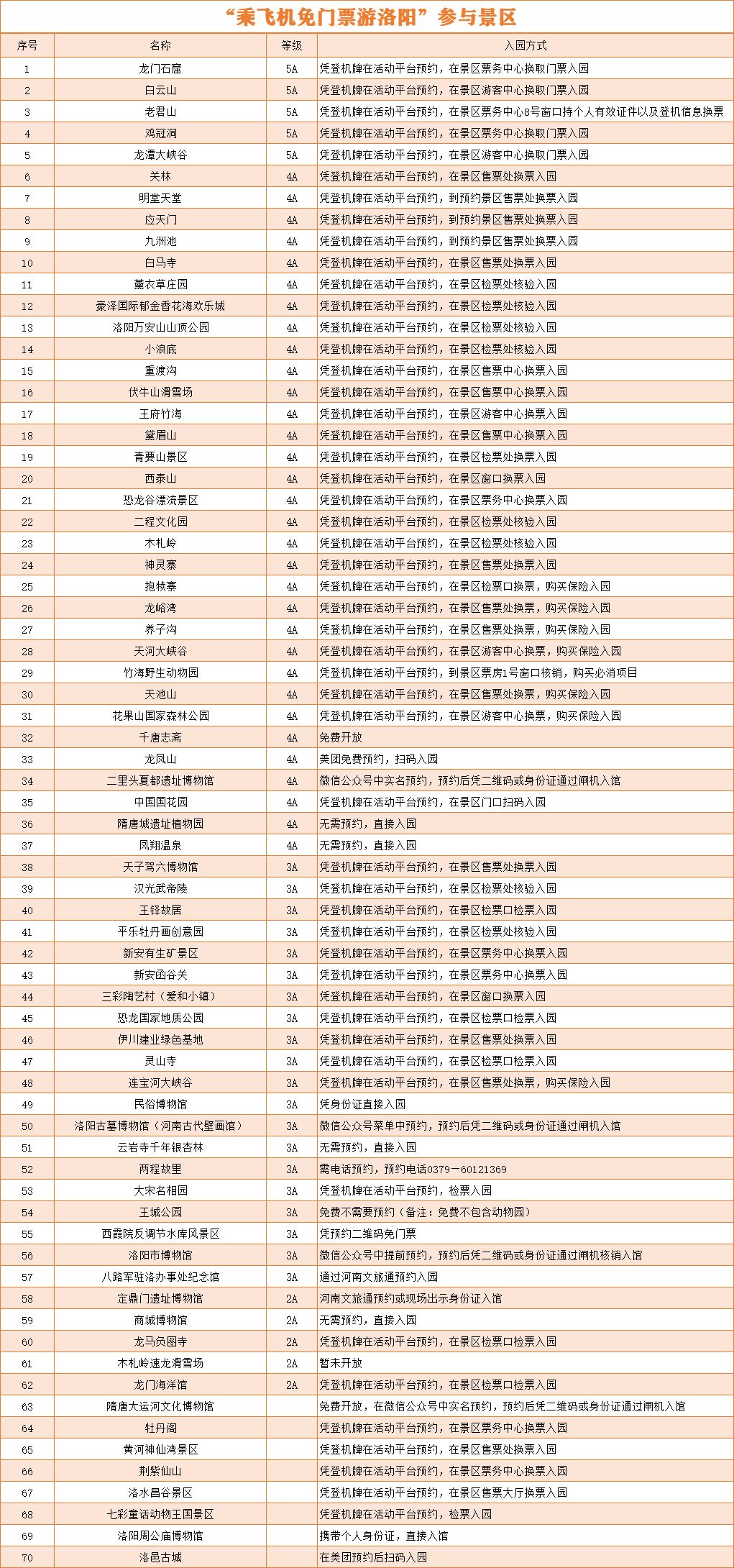 2023年7月18日起至2023年12月31日,洛陽市推出“乘飛機免門票游洛陽”活動,乘坐抵達洛陽機場航班的乘客,在抵達洛陽后10天內(含當天),憑登機牌(紙質/電子)通過預約全市70家旅游景區(qū)的首道免費門票暢游洛陽。