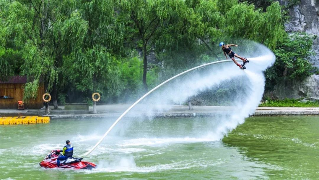 兩條白色的水柱仿佛蛟龍出海般沖出水面,表演小伙時(shí)而在空中盤(pán)旋,時(shí)而沖進(jìn)水面,做著一個(gè)個(gè)驚險(xiǎn)刺激的動(dòng)作,好似與驕陽(yáng)一爭(zhēng)高低!當(dāng)然,青天河景區(qū)對(duì)膽子大的游客還提供了親身體驗(yàn)的機(jī)會(huì),快來(lái)參與!