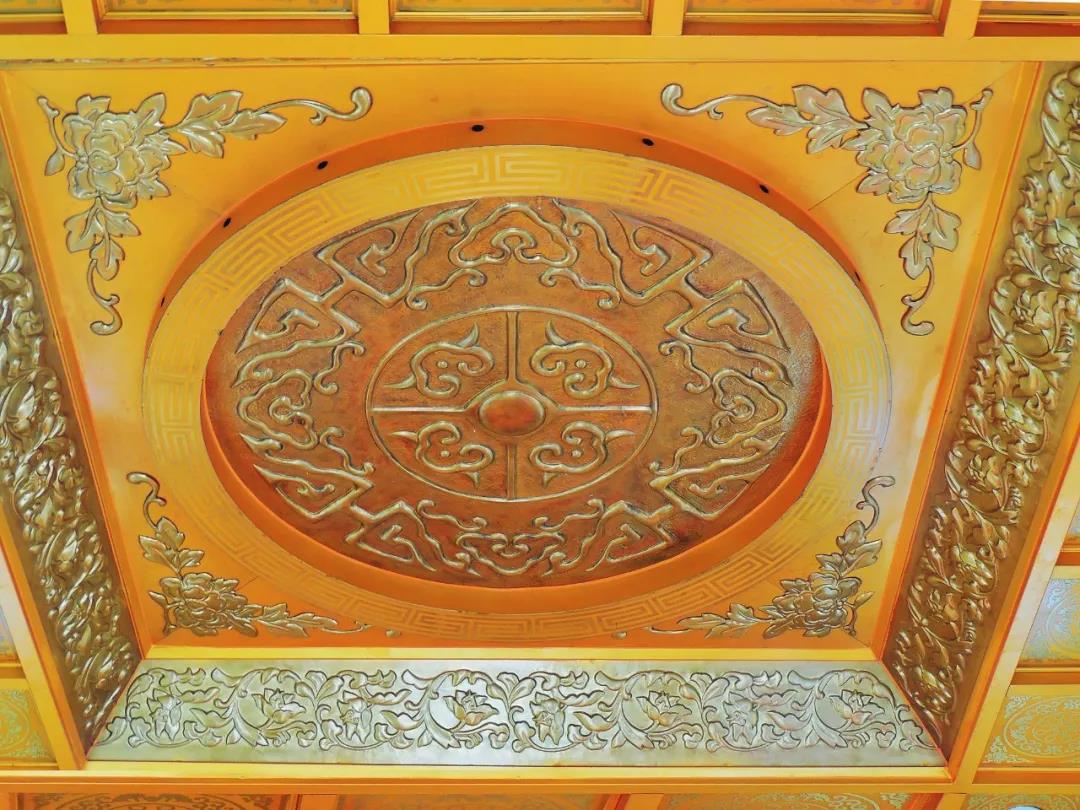 亮寶臺(tái)為重檐歇山式建筑,全銅裝飾,銅鑄鎦金,金光熠熠。脊上有大吻和神獸,歇山頂亦叫九脊頂。正脊,又叫大脊、平脊,位于屋頂前后兩坡相交處,是屋頂最高處的水平屋脊,正脊兩端有吻獸。吻,又稱正吻、大吻,是明清時(shí)期建筑屋頂正脊兩端的裝飾掛件,為龍形頭,龍口大張咬住正脊。