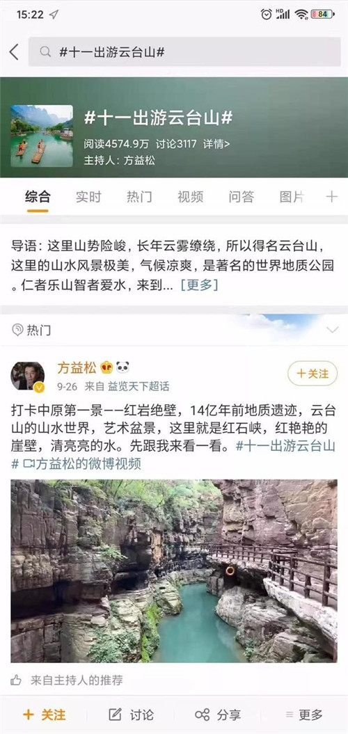 在微博傳播方面,網(wǎng)友參與度、傳播度較高,#音樂嬉水季打卡云臺(tái)山#話題閱讀量高達(dá)1.7億次,#十一出游云臺(tái)山#話題閱讀量近4000萬,也有眾多旅行大V參與其中,爭(zhēng)相打卡。在微信傳播方面,云臺(tái)山景區(qū)微信公眾號(hào)365天不間斷更新,第一時(shí)間為游客提供服務(wù),與網(wǎng)友進(jìn)行互動(dòng),2018年云臺(tái)山微信公眾號(hào)榮獲全國(guó)旅游景區(qū)微信影響力top10。