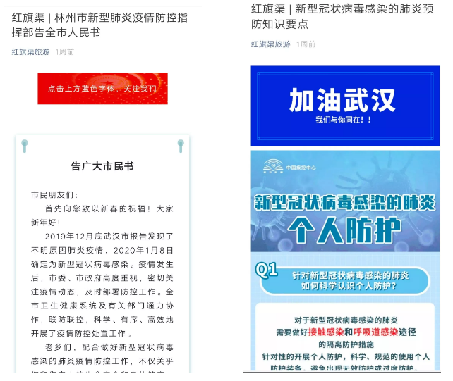 新型冠狀病毒感染的肺炎疫情時時刻刻牽動著人們的心,在當前眾志成城抗擊疫情的嚴峻形勢下,謠言將加劇公眾恐慌情緒,對疫情防控帶來不利影響,甚至造成“次生疫情”。因此,增強信息識別、抵制謠言成為疫情防控工作重要的一部分。紅旗渠景區(qū)通過微信公眾號、微博、今日頭條等平臺轉發(fā)國家官方媒體發(fā)布的關于新型冠狀病毒感染的肺炎疫情,幫助大家了解病毒、認識病毒,從而很好的預防疫情蔓延。
