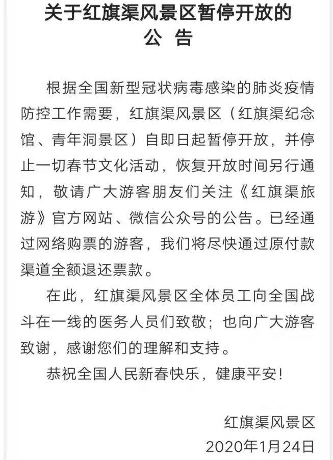 疫情爆發(fā)前期,為保障游客的安全,景區(qū)第一時間暫停所有春節(jié)活動,立即組織召開“關于新型冠狀病毒肺炎疫情緊急會議”,傳達了林州市委、市政府對疫情防控工作的有關要求,1月24日發(fā)布景區(qū)暫停開放公告,并妥善處理好每一起游客退訂,做到無一例游客投訴。