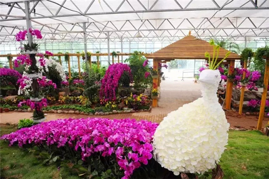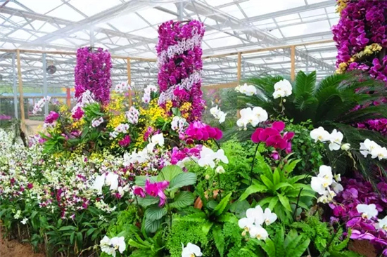 細細長長的花梗勾勒出優(yōu)美的弧度,花梗盡頭開出白色、紅色、紫色的花朵,好像振翅欲飛的蝴蝶在風中舞動,這就是“洋蘭王后”蝴蝶蘭。本次蝴蝶蘭展以原生態(tài)為主題,利用枯藤樹枝、精品花卉、綠草、竹排等自然產物為主元素,為大家呈現“彩云逐月”、“飛流照影”、“幽谷聽蘭”、“馨巢蘭韻”、“童話森林”、“綠色家居”等十大主題場景。在4000平方米的溫室內百余種、6萬株蝴蝶蘭將迎頭怒放,玫紅、紫紅、鮮黃、粉白花朵掛滿枝頭,形成色彩艷麗、百花盛開、萬紫千紅的美麗景象。