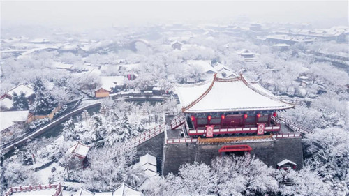 園內(nèi)建筑雖被風雪包裹,但仍然靜靜屹立、凝望遠方,仿佛沒有任何困難能使其動搖。這貫穿古今的千年畫卷雖歷經(jīng)風雪,但仍然生機勃勃、燦爛輝煌,仿佛沒有任何紛擾能使其黯淡無光!