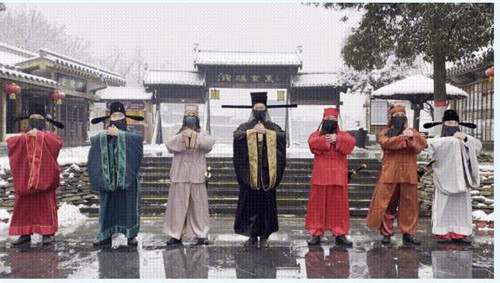 包大人攜王朝馬漢張龍趙虎,在風雪中開園迎賓,奏樂相迎!
