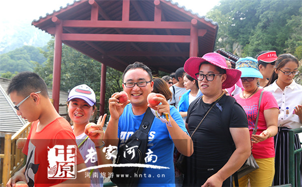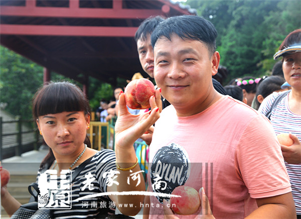 8月14日,河南老君山景區(qū)中靈索道候車區(qū)。景區(qū)工作人員正將質新鮮大白桃送到游客手中!