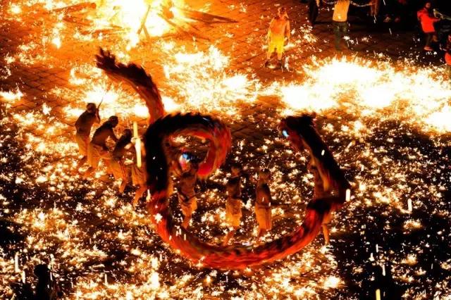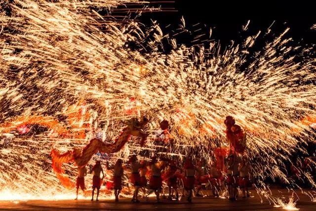 "龍舞"之首:這種舞以鐵水打金花,輔以不同材質(zhì)的導(dǎo)引火、口中火、脊上火、腹中火、場(chǎng)中火、升天火...組成一片狂熱的立體火陣,極為熱烈多彩