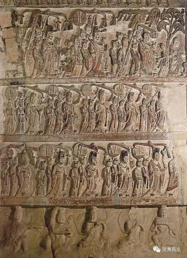 帝王頭戴平天冠,右手持蓮枝,左手置于侍者所捧香爐中,兩側(cè)侍者或為王者牽衣,或持扇、持裝飾華麗的傘蓋。其余男像皆戴高冠,各與身邊持傘、扇之侍從形成一組。女像頭戴蓮花冠,各自都有持傘、扇的侍從。每層浮雕由于方向、服飾的一致而形成強(qiáng)烈的整體感,而上部空間由于斜向的羽扇、傘蓋和飄動著的結(jié)帶以及人物的參差錯落而增加了畫面的變化。