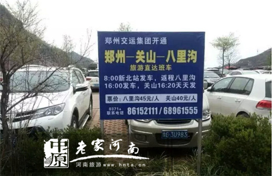 4月2日起,直通車每日一班,早上8:00從新北站出發(fā),下午16:00八里溝返程,鄭州—關(guān)山景區(qū)票價(jià)40元/位,鄭州—八里溝、回龍·天界山和九蓮山景區(qū)45元/位。(咨詢電話:0371—65996122)