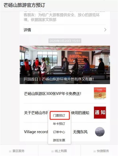 1、購票前,游客需提前關(guān)注“芒碭山旅游官方預(yù)定”公眾號,點擊“進入公眾號”