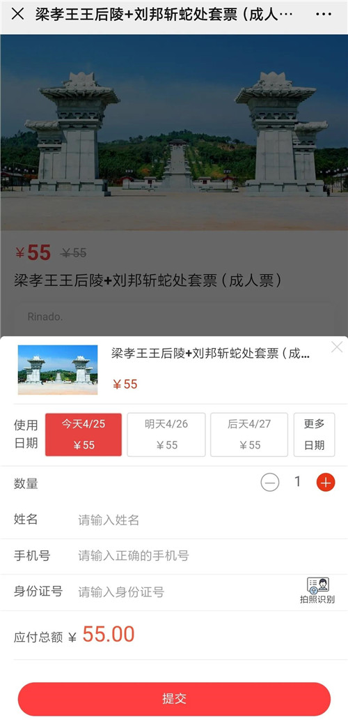 3、漢梁王陵景區(qū)+劉邦斬蛇處套票:成人票價為55元/人。