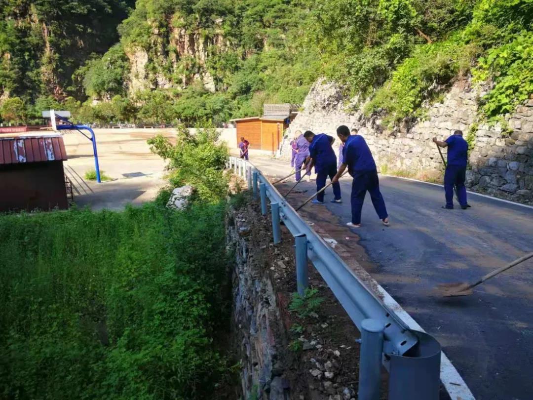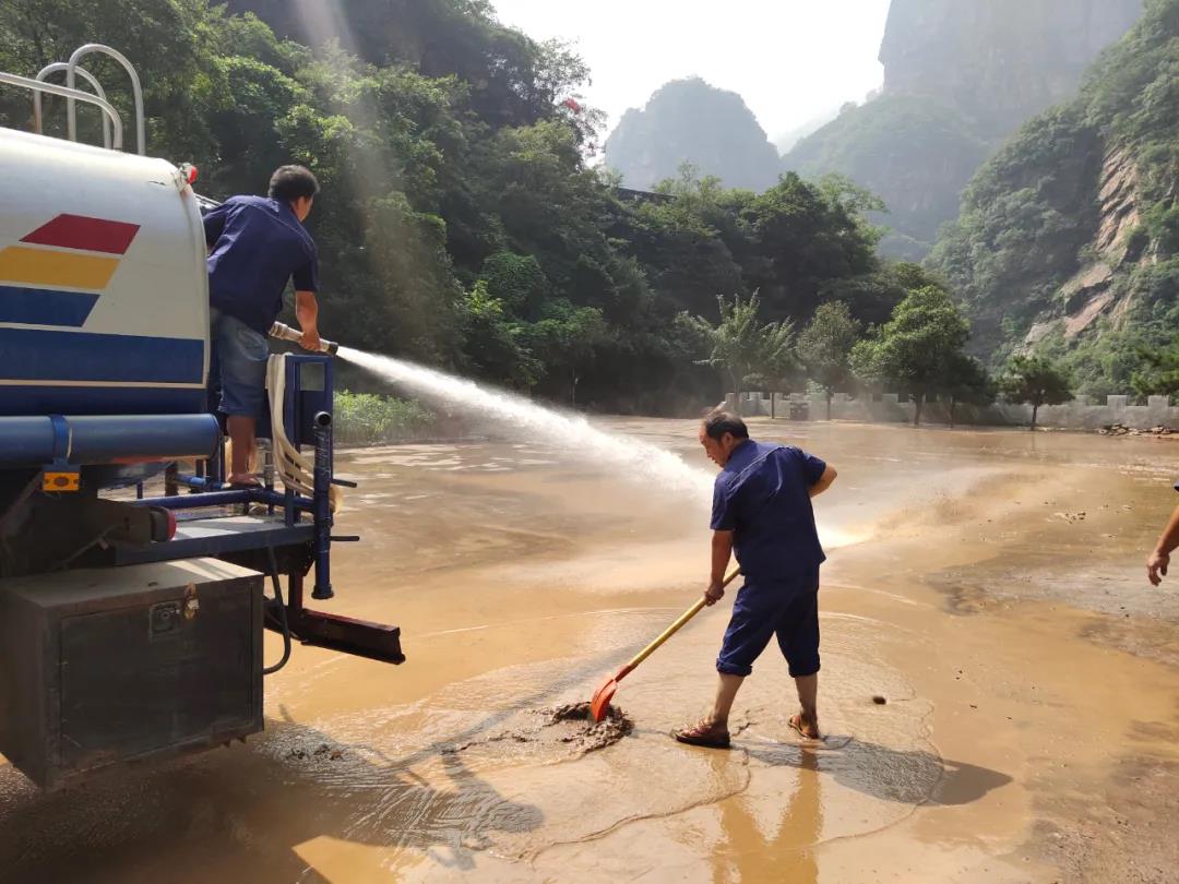 景區(qū)動(dòng)用鏟車、灑水車等工具和眾多員工積極開展淤泥、落石、山體滑坡、垃圾等障礙物的清理。修復(fù)被沖毀的道路、橋梁,爭取在最短的時(shí)間內(nèi),恢復(fù)交通。