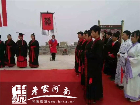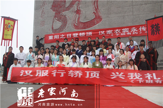 2015年轎頂山首屆漢服文化旅游節(jié)于10月18日在新鄉(xiāng)市輝縣轎頂山旅游景區(qū)成功舉辦。此次漢服文化旅游節(jié)活動,轎頂山景區(qū)推出漢服祈福轎頂山、漢服等轎頂、器樂演奏、禪茶雅集、篝火晚會等豐富多彩的文化活動;顒悠陂g許多游客親自參與漢服祈福轎頂山祈;顒樱惺軡h服魅力,傳承漢服文化。